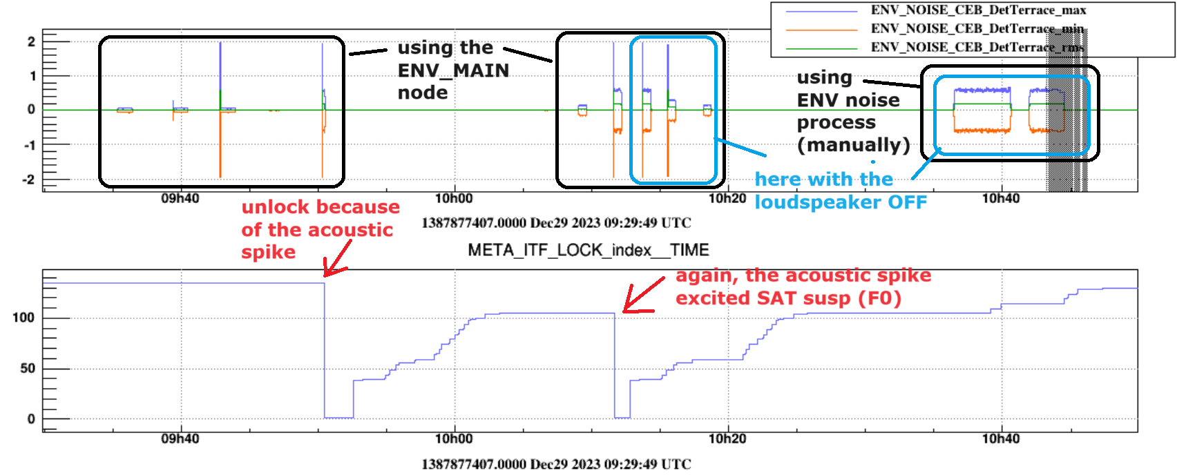 - at about 10:00 UTC, the ITF unlocked while injecting a magnetic sweep followed by a colored acoustic noise. It seems that the ITF unlocked because of the acoustic noise. Figure 1 and Figure 2.