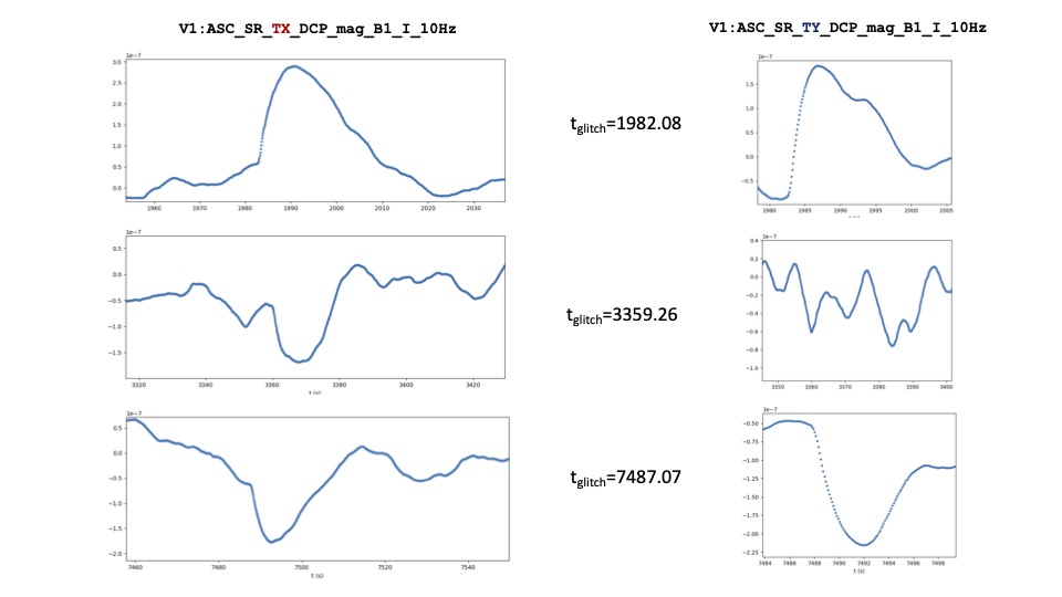 Among all the above, the only channels found correlated are those of the family: V1:ASC_SR_{TX,TY}_DCP_{phi,mag}_B1_*. The fact that they are correlated may mean that they are simply witnessing or reacting to the glitches, without telling anything new about their presence. However, they don't list among the BruCo excluded channels: /data/dev/detchar/online/bruco/share/virgo_excluded_channels_Hrec_hoft.txt.