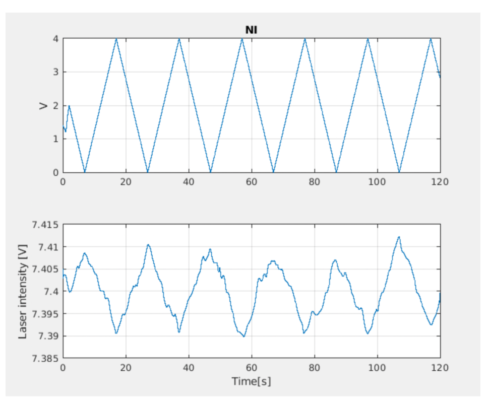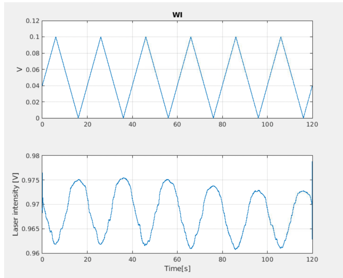 As the first step, we injected a triangular wave with long period (20 s) to look at the DC gain of the conversion Piezo voltage/laser power, and to find a suitable linear response region