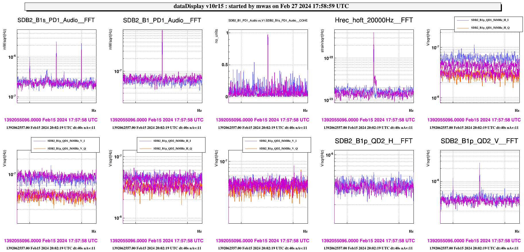 Figure 1 looking at the NI DAS line injection at 85Hz with in blue SR aligned (LN2) and in purple SR misaligned (LN3). The height of the line is lower in Hrec when SR is aligned, but it has the same height on B1s (OMC reflection). Something interesting is that the line is visible on B1p QD2 V but not in the H direction. It coulde mean that the NI DAS injection is modulating a HOM that has is mostly in the vertical direction, or that it creates a vertical beam jitter.