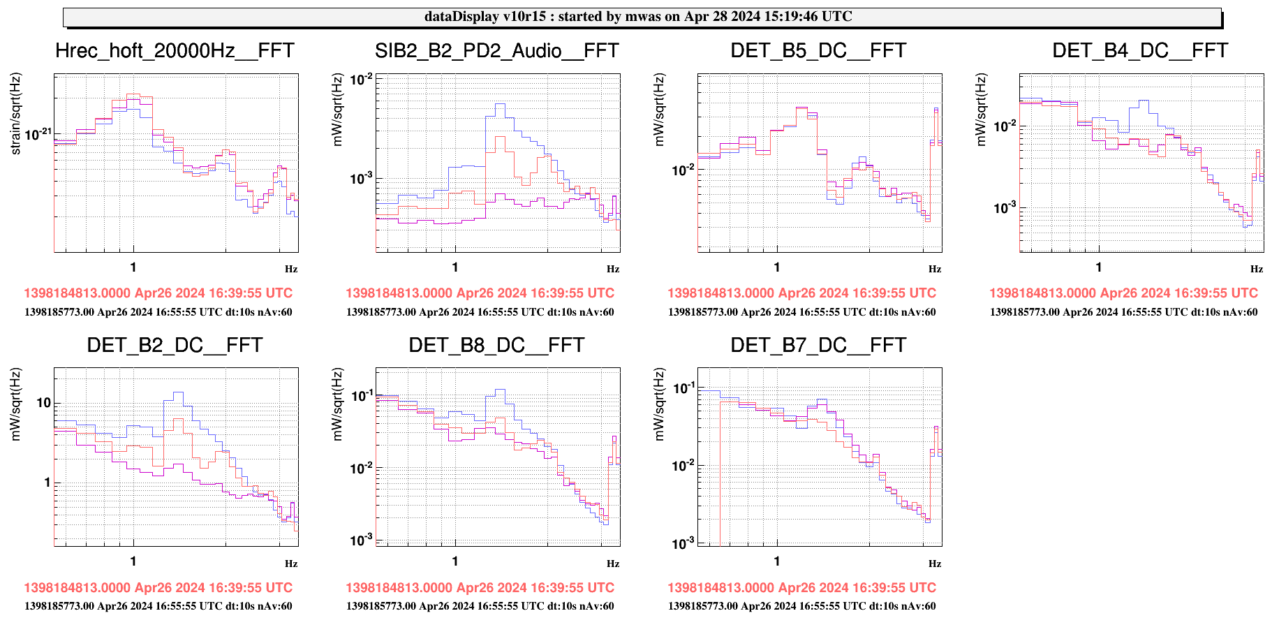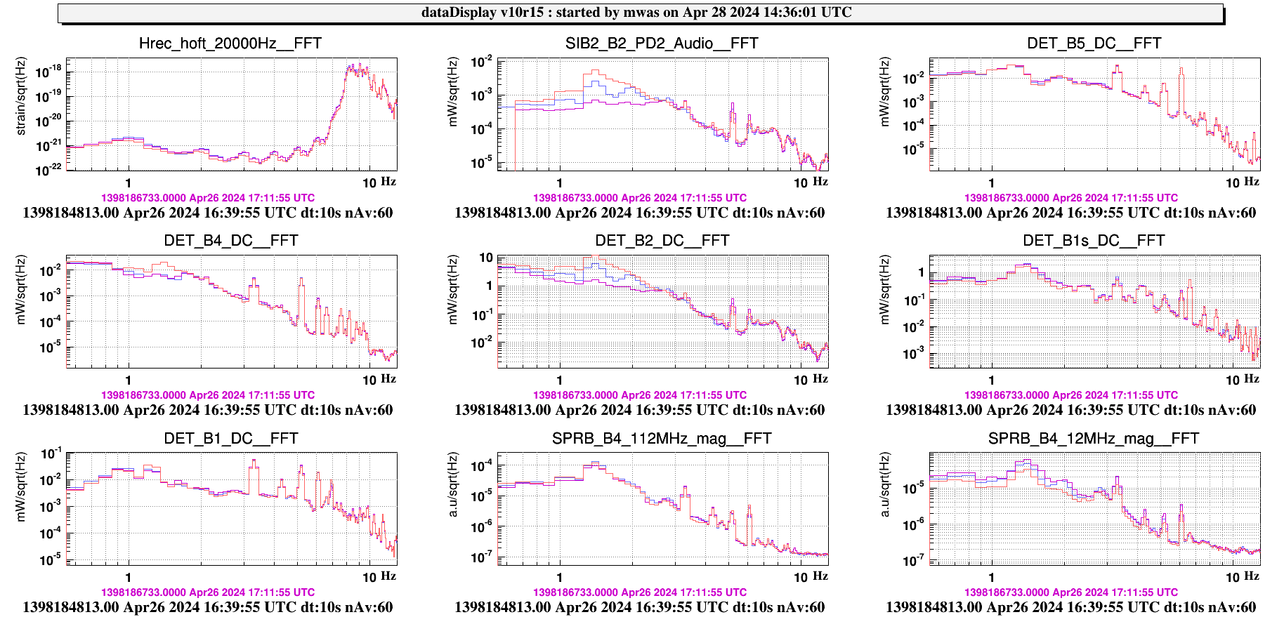 Figure 2 compares the time with the frequency noise coupling to minimized (blue) to the normal situation (purple). The B2 noise is 10 times lower between 1Hz and 3Hz, and it is also lower above 1kHz where the frequency noise is dominant. In between B2 is dominated by the pole at ~500Hz noise, subtracting it using B5 or B4 could reveal more clearly the improvement in coupling of frequency noise to B2 at other frequencies. There is no wideband impact on the h(t) noise.