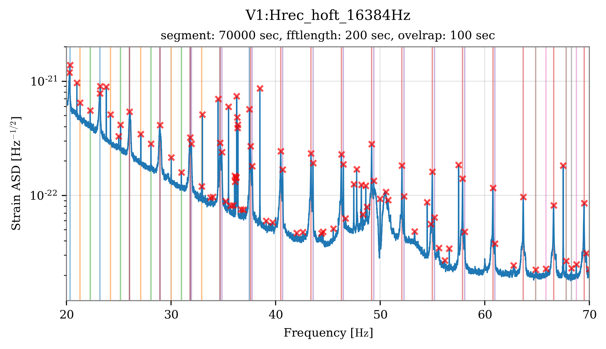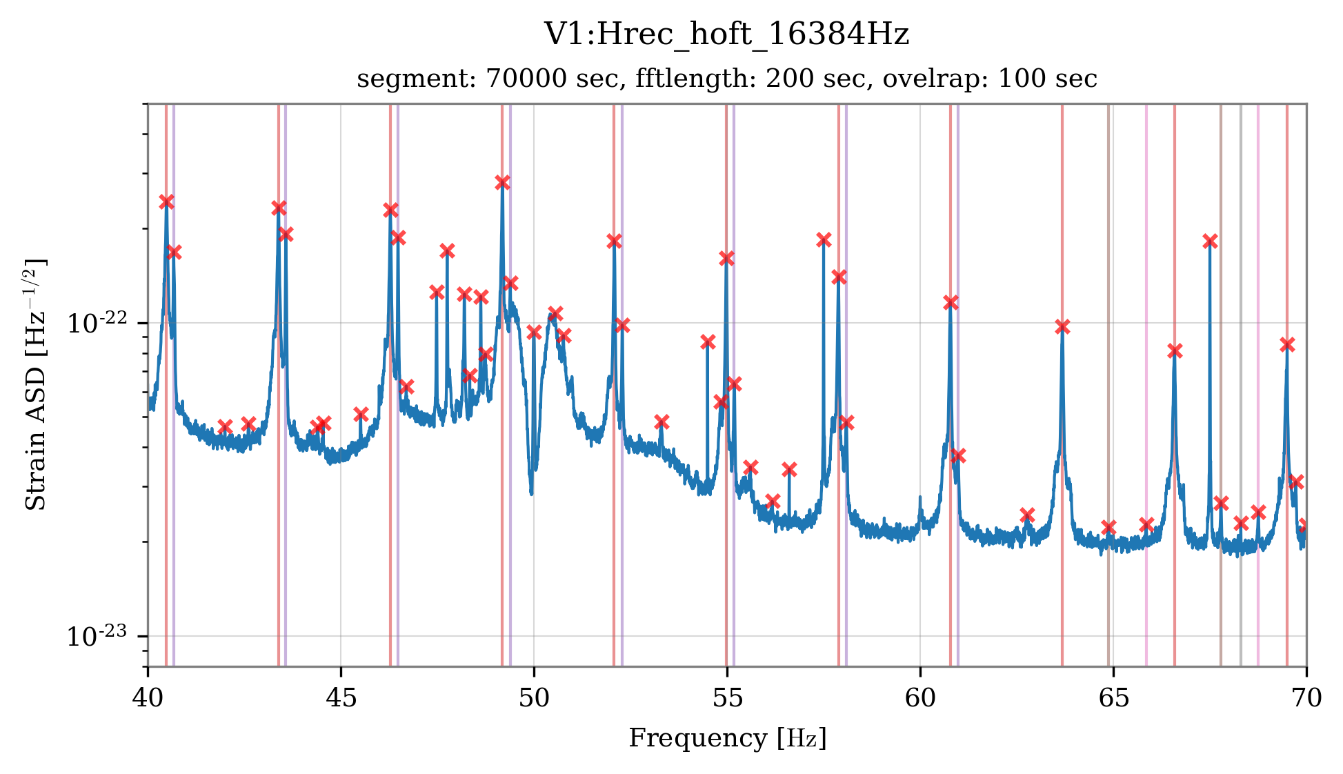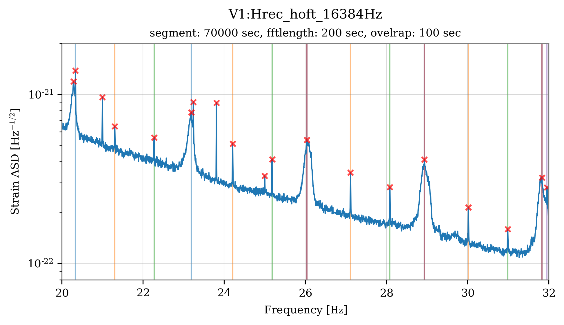 The amplitude of the spectral lines appears to scale approximatively as f^−2.5. Figure 1 shows the ASD of 70k sec of Hrec data, 200 sec fftlength from the long lock on April 25-26, with a comparison with reference power laws: f^−2 (characteristic of a triangular wave), f^−2.5, and f^−3. This suggests that the signal may originate from a triangle wave subsequently filtered by a smoothing filter, such as a low-order low-pass filter, with a frequency response approximately f^−0.5 in the observed range. Alternatively, this could correspond to the action of a fractional integrator of order 0.5.