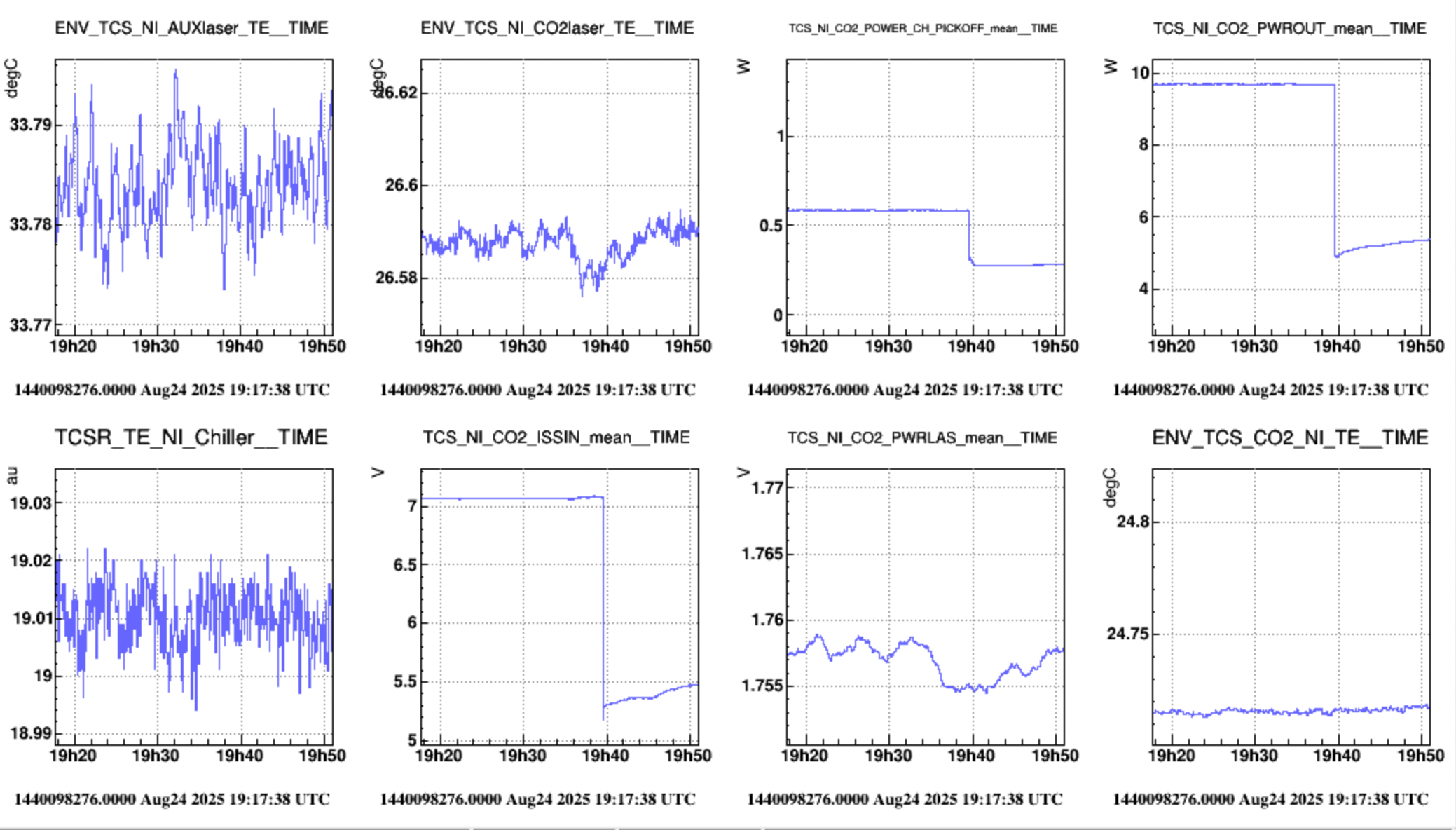 The image of this evening shows a localized hot spot not present in the earlier image, suggesting a possible partial obstruction of the beam path leading to power loss. This is consistent with the fact that the beam sampler at the laser output (TCS_NI_CO2_PWRLAS) shows no variation, while other bench signals do (see Fig. 2).
