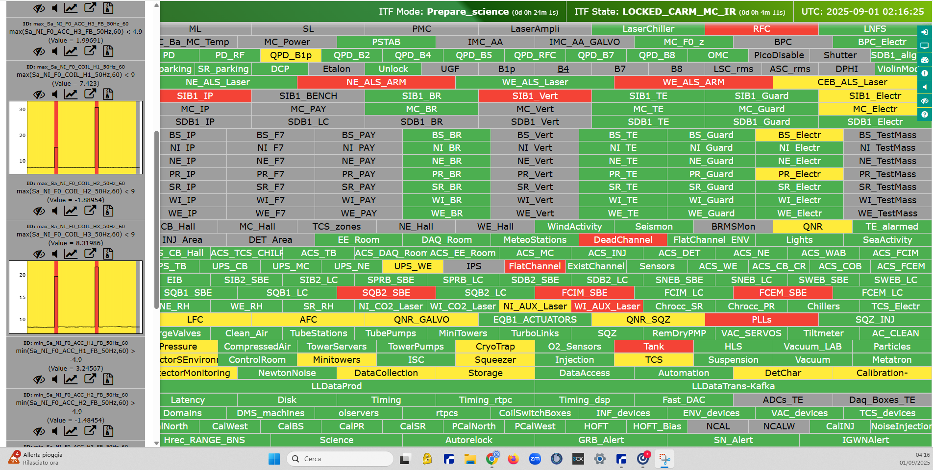 ITF found locked in LOW_NOISE_3 with SCIENCE mode (Autoscience ON) and SIB1 ID loop open (entry #67607) to circumvent F0 control problems preventing relock (#67604). BNS Range unstable, oscillating between 49-54 Mpc. ITF and IMC unlocked at 01:52UTC (pdf 1) and 02:03UTC at LOCKING_CARM_MC_IR (pdf 2). Back to LN3 at 03:03UTC in SCIENCE (Autoscience ON) at 03:06UTC. ITF left locked.