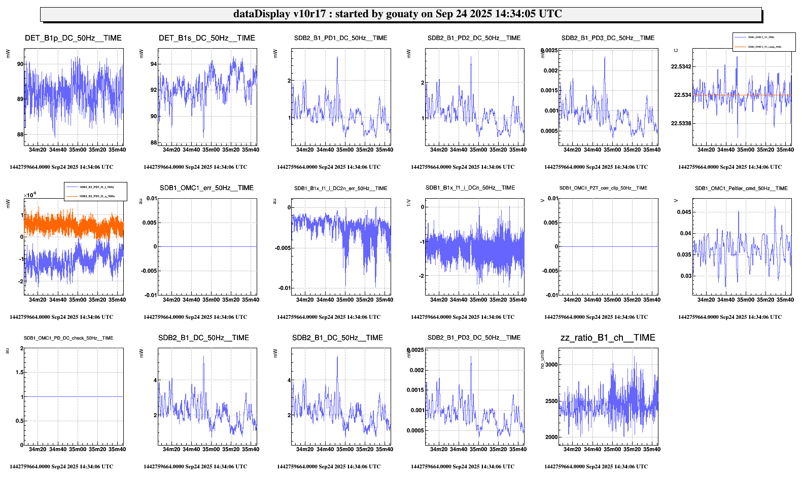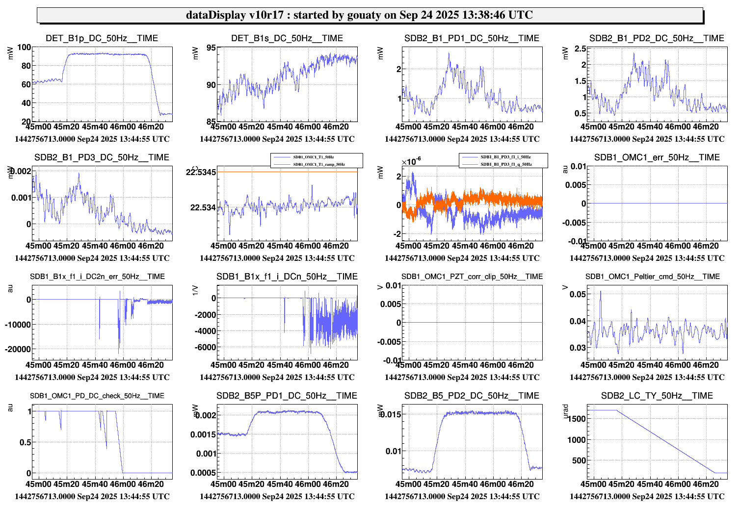 Corrected B1 PD1/2/3 DC offsets at 14h16 LT. To be noted that when I reloaded the configuration of SDB2_dbox_bench, the process SDB2_LC became blue. Stopping and restarting the process SDB2_LC (after opening the angular and position loops) solved the isssue. Next time Alain suggests to reconfigure the ADC mezzanine reading the LVDT "in" instead of stopping/restarting the process.
