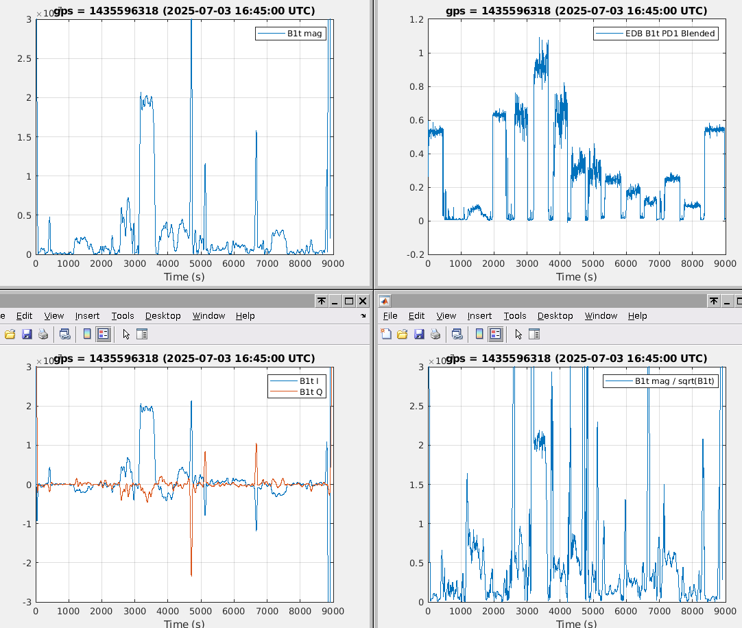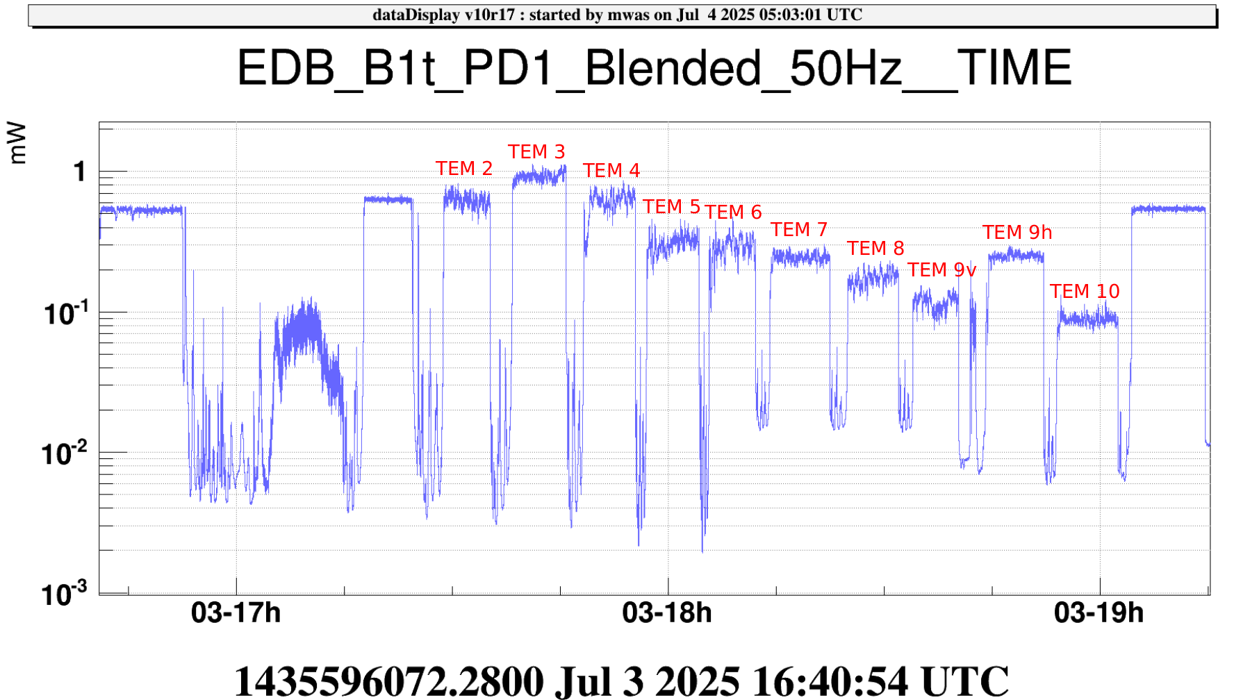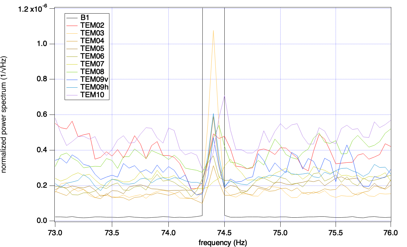 Locking the EDB auxiliary OMC on high order modes allows to search for possible couplings between high order modes and the DARM TEM00 mode on the dark fringe beam. Looking at data from Jul 3 one can see that the strongest DARM lines at 74 Hz and 491 Hz are visible in some of the spectra of the EDB OMC transmission when the OMC is locked on HOMs. The first two attached pictures show the RIN spectra of the OMC transmission - i.e. EDB_B1t_PD1_blended normalised to the mean DC value (EDB_B1t_PD1_DC, see last plot) for the various HOMs, zoomed around the two main DARM lines at ~74 Hz and ~491 Hz. RIN spectra are in linear vertical scale, have 50 mHz resolution, and are averaged over about 5 minutes each. The B1 RIN spectrum is also shown in black. The set includes a spectrum for each HOM up to order 10; there are two measurements for order 9 HOMs, with horizontal (TEM81) and vertical (TEM09) shape.
