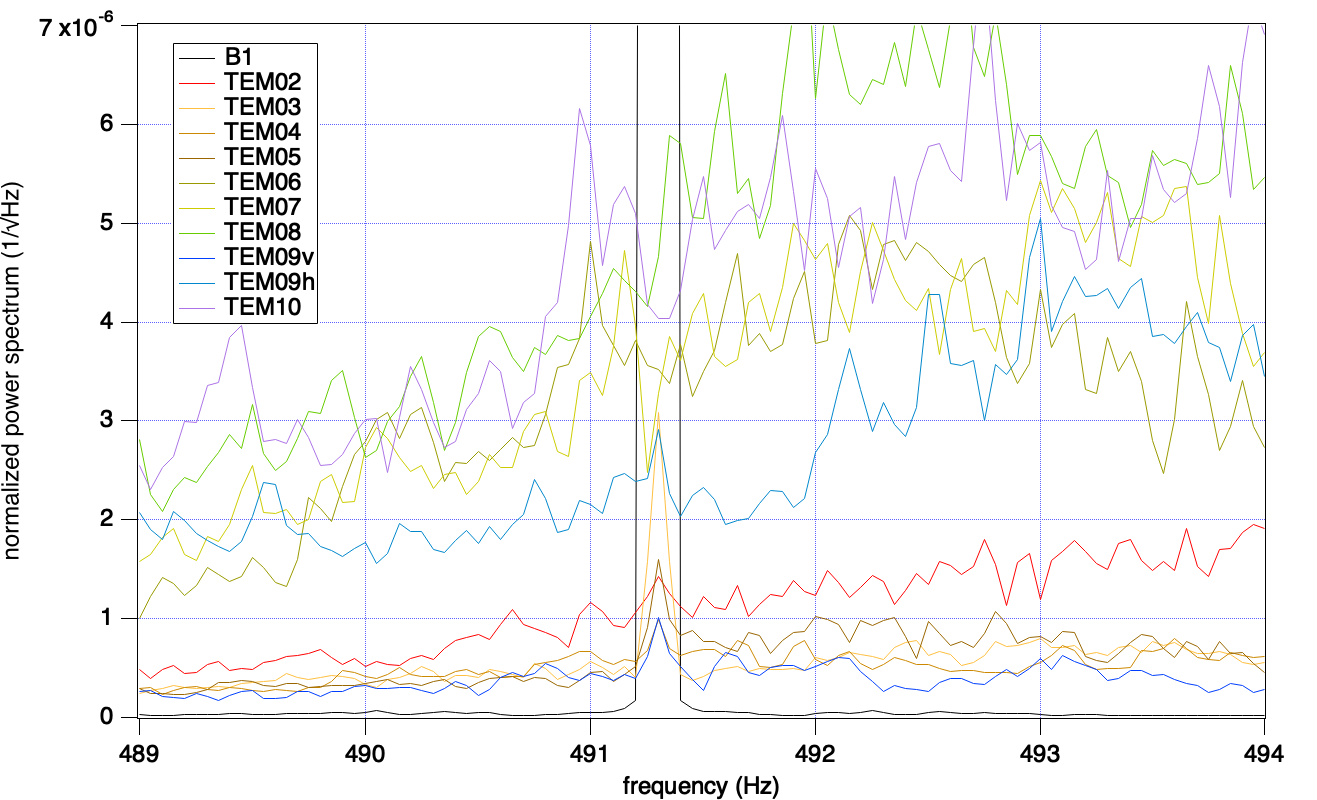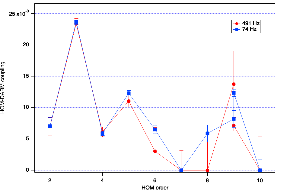 The DARM lines are visible in many of the HOM RIN spectra, but the SNR is better at 74 Hz than at 491 Hz. An estimate of the coupling between HOMs and TEM00 can be obtained by the ratio of line amplitude in HOMs and DARM spectra. The third plot shows the result, where for each HOMs the line amplitiude is computed after quadratic subtraction of the mean background noise around the line frequency, and error bars are the standar deviation of RIN spectra in the frequency regions shown in the plots (with the lines excluded). From the plot one can deduce that: