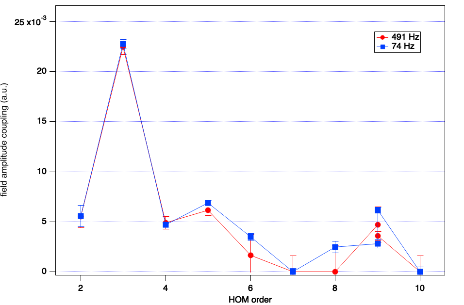 - the coupling is substantially higher (~2.5%) for order 3 mode than for any other mode. In particular, for the lowest even modes (order 2 and 4) the coupling is ~5 times smaller than for order 3.