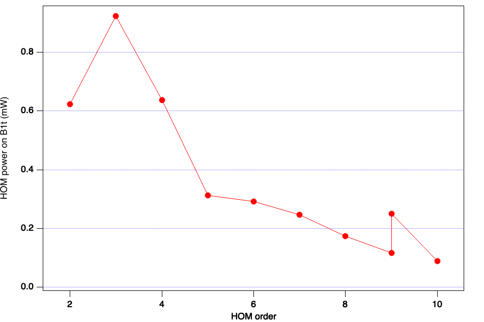 3) the estimated coupling with DARM is highest for TEM03; it decrease with HOM order but has a peak on orders 8÷9