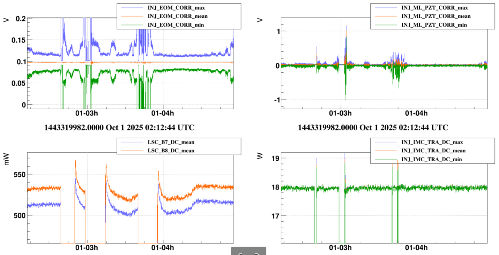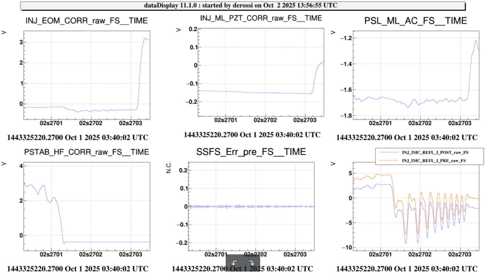 We can observe EOM and PZT corrections increasing a few minutes before the unlock (fig.1) and the error signal oscillating at 60kHz just before the unlock (fig 2.)