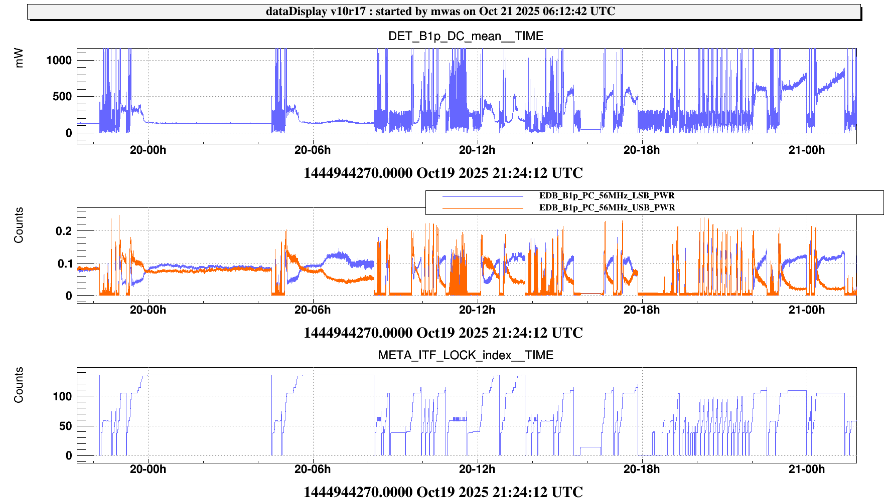Figure 1. Yesterday the power on B1p in CARM NULL 1F became consistently higher, increasing from typical 300-400mW, to 500mW or more. At the same time the 56MHz sideband balance on B1p has changed, instead of having the USB with about double the power of the LSB in CARM NULL 1F, the USB power has started to drop off very quickly after reaching CARM NULL resulting in a misbalance in the opposite direction, with LSB having double the power of the USB.