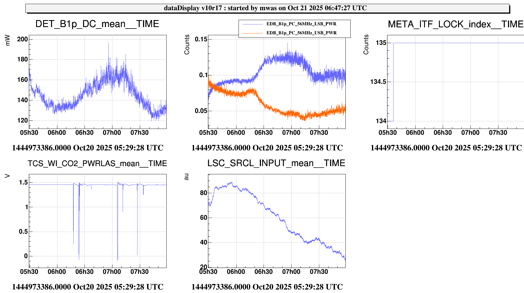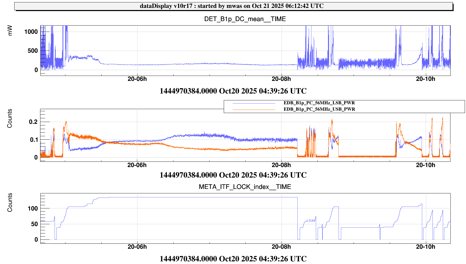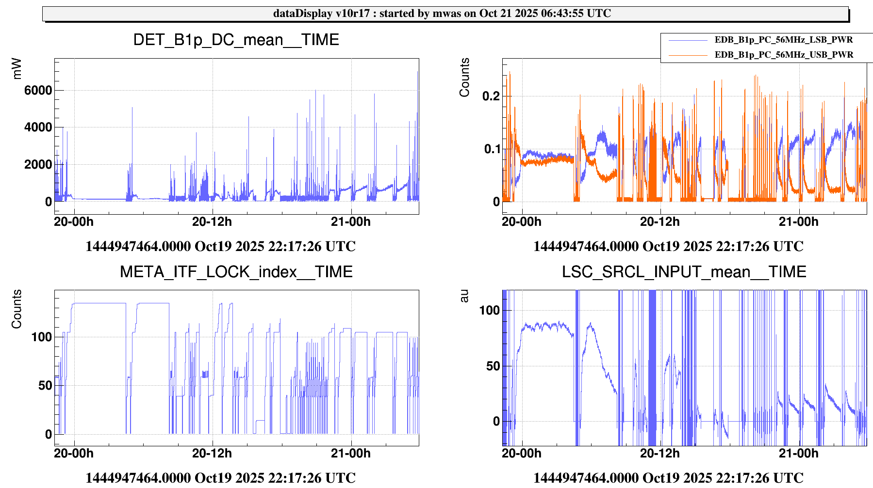 Figure 3. Another witness of the issue is SRCL INPUT that has become systematically lower by a factor few. That behaviour looks to have started at ~6:20 UTC, at the same time as the sideband balancing changed during a LN3 lock.