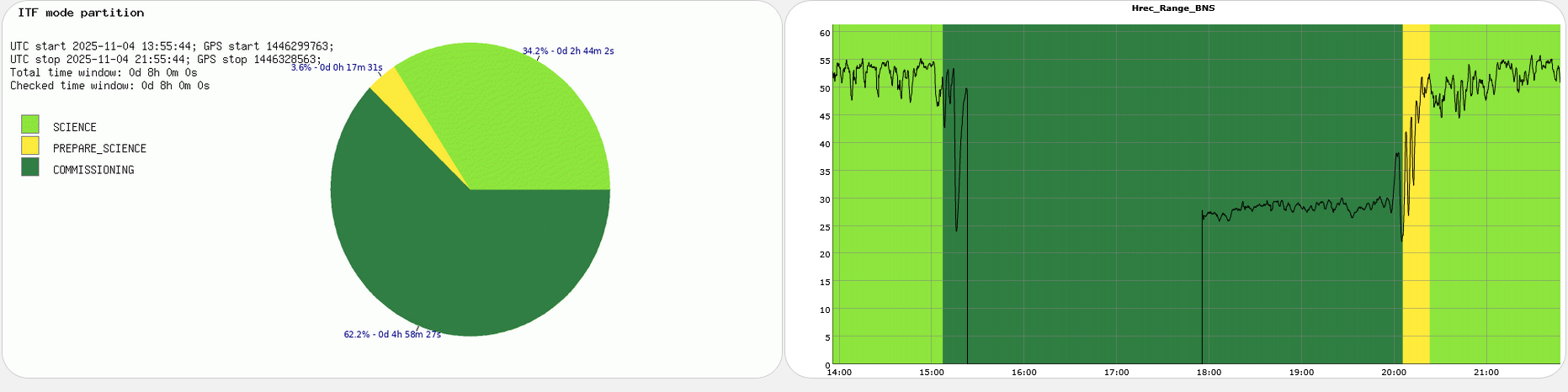 At 15:07 UTC ITF in Commissioning mode; Commissioning activity concluded at 20:05 UTC. The ITF was relocked in LN3 and the beginning of the lock there were strong oscillations in Hrec_Range_BNS; Science mode was set at 20:23 UTC.