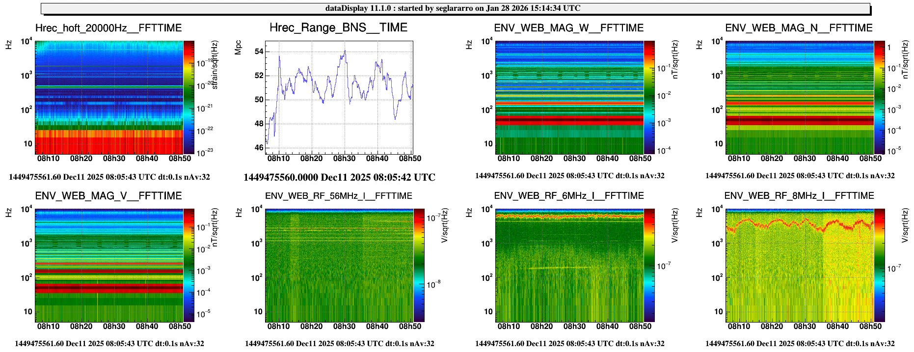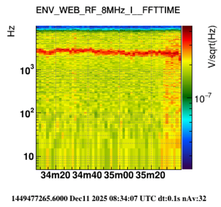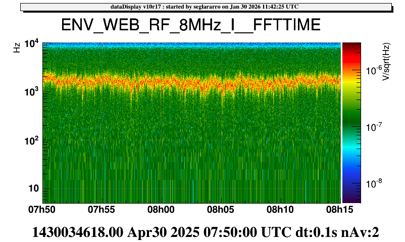 Results of the channels identified are attached in the figures. I did not identify any disturbance in h(t) or most of the ENV RF channels. I see two features in the RF channels, a line (120Hz) and an overall change (8:35:25). Yet, the line starts two minutes before the start of the WIFI test (8:16:10), thus discarding a connection with it. Instead, the channel ENV_WEB_RF_8MHz_I presents an overall effect that seems to coincide with the start of the RS485 test. This does not seem to have a large impact of Hrec or the BNSrange. Since the interferometer unlocked just after the test, I can not verify if this effect stays once the RS485 tests finishes.