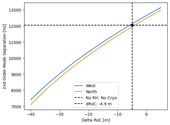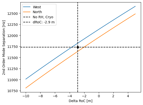 Now, given the static offsets, we can now compute the effect (assuming all of the effect of the RH is on the ETM). Given a IM RoC (computed above) and a second order mode seperation, we can compute the RoC change on the end mass. In both cases it comes out to -25.0m, i.e. the RoC gets shorter and the mirror is more curved.