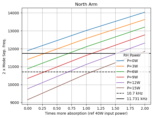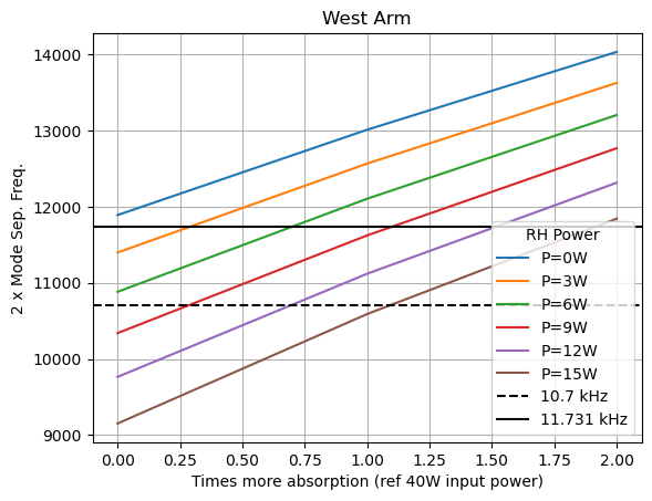 We can then explore the range of 2nd order mode frequencies as a function of absorbtion and RH power, which is shown in the attachements. See the example in Finesse to update your code to use these parameters.
