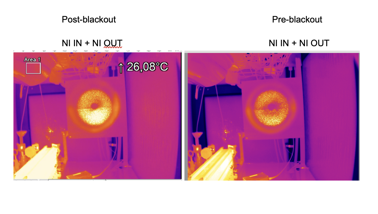 Suzanne opened the acoustic enclosures housing the CO₂ benches to verify that all power meters and thermal cameras were powered on. All devices were ON and appeared to be working properly.